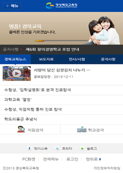 ¸ð¹ÙÀÏ È¨ÆäÀÌÁö´Â °æ»óºÏµµ±³À°Ã» ȨÆäÀÌÁö ³»¿ëÀ» ½º¸¶Æ® ÆùÀ¸·Îµµ ½±°Ô º¼ ¼ö ÀÖµµ·Ï ÇØ ´©±¸³ª °æºÏ±³À° Á¤º¸¸¦ ¼Õ½±°Ô Á¢ÇÒ ¼ö ÀÖµµ·Ï °³¼³µÆ´Ù. ƯÈ÷, ±âÁ¸ÀÇ ÀÎÅÍ³Ý È¨ÆäÀÌÁö¿¡¼­ À̿뵵°¡ ³ôÀº °æºÏ±³À°´º½º, º¸µµÀÚ·á, Àλç/½ÃÇè, °øÁö»çÇ× µîÀ» Áß½ÉÀ¸·Î ½º¸¶Æ®Æù »ç¿ëÀÚ°¡ ¾ðÁ¦ ¾îµð¼­³ª ÇÊ¿äÇÑ Á¤º¸¸¦ ½±°Ô È®ÀÎÇÒ ¼ö ÀÖµµ·Ï ±¸¼ºµÆ´Ù.