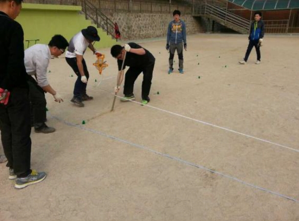 ¿îµ¿Àå ¶óÀÎÇ® ÀÛ¾÷Àº Çб³ ¿îµ¿Àå Å©±â¿Í ±¸Á¶¸¦ °í·ÁÇØ ´Ü°Å¸® ´Þ¸®±â¸¦ ÇÒ ¼ö ÀÖ´Â 50m ¶óÀÎ, 120~180mÀÇ Æ®·¢, ¹ß¾ß±¸(Ƽº¼) ¹× ÇDZ¸Àå µîÀ» ¸¸µé¾îÁÖ´Â ÀÏÀÌ´Ù.