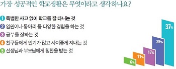 ´ÙÀ½À¸·Î ¡®¹Ì·¡ÀÇ ¼º°ø¡¯ÀÌ ¾Æ´Ñ ¡®¿À´ÃÀÇ ¼º°ø¡¯¿¡ ´ëÇØ ¹°¾ú´Ù. ¾ÆÀ̵éÀÌ »ý°¢ÇÏ´Â °¡Àå ¼º°øÀûÀÎ Çб³»ýȰÀº ¡®Æ¯º°ÇÑ »ç°í ¾øÀÌ Çб³¸¦ Àß ´Ù´Ï´Â °Í(37%)¡¯, ¡®ÀÓ¿øÀ̳ª µ¿¾Æ¸® µî ´Ù¾çÇÑ °æÇèÀ» ÇÏ´Â °Í(29%)¡¯À̶ó´Â ÀÀ´äÀÌ °¡Àå ³ôÀº ºñÁßÀ» Â÷ÁöÇß´Ù. ÃÖ±Ù ¹ß»ýÇÑ ¼¼¿ùÈ£ Âü»ç·Î ¾ÈÀü¿¡ ´ëÇÑ °æ°¢½ÉÀÌ ¹Ý¿µµÈ °á°ú·Î º¸¿©Áø´Ù.
