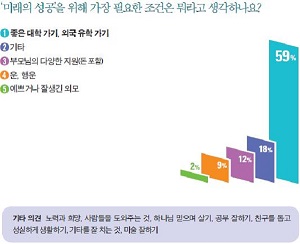 ¹Ì·¡ ¼º°øÀ» À§ÇÑ ÇÊ¿äÁ¶°ÇÀ» ¹¯´Â Áú¹®¿¡ ´ëÇÑ ´äº¯À¸·Î´Â ¡®ÁÁÀº ´ëÇÐ °¡±â, ¿Ü±¹ À¯ÇÐ °¡±â(59%)¡¯°¡ °¡Àå ³ô°Ô ³ªÅ¸³µ´Ù. ¿ì¸® »çȸ Çз À§ÁÖÀÇ Ç³Åä°¡ ¾ÆÀ̵鿡°Ôµµ ¸¸¿¬ÇØÀÖ´Â °ÍÀº ¾Æ´ÑÁö ¿ì·Á½º·´Áö¸¸ ÁÁÀº ¹æÇâÀ¸·Î »ý°¢Çغ¸¸é ¡®ÇлýÀ¸·Î¼­ ÀÚ½ÅÀÇ ¿ªÇÒ¿¡ Ãæ½ÇÇϰڴ١¯´Â ÀÇ¹Ì¿Í ¡®½º½º·Î ³ë·ÂÇÏ¿© ÀϾ°Ú´Ù¡¯´Â ¸¶À½ÀÇ Ç¥ÇöÀ¸·Î ÀÌÇØÇÒ ¼ö ÀÖ´Ù.