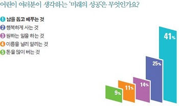 ¾î¸°À̵éÀÌ »ý°¢ÇÏ´Â ¡®¹Ì·¡ÀÇ ¼º°ø¡¯Àº ¡®³²À» µ½°í º£Çª´Â °Í(41%)¡¯, ¡®ÇູÇÏ°Ô »ç´Â °Í(25%)¡¯, ¡®¿øÇÏ´Â ÀÏÀ» ÇÏ´Â °Í(14%)¡¯, ¡®À̸§À» ³Î¸® ¾Ë¸®´Â °Í(11%)¡¯, ¡®µ·À» ¸¹ÀÌ ¹ö´Â °Í(9%)¡¯ ¼øÀ¸·Î ³ªÅ¸³µ´Ù. ¿ì¸® »çȸ°¡ ÈçÈ÷ ¼º°øÀ̶ó°í ¿©±â´Â ¡®À̸§À» ³Î¸® ¾Ë¸®´Â °Í¡¯°ú ¡®µ·À» ¸¹ÀÌ ¹ö´Â °Í¡¯ µîÀÌ ¾ÆÁ÷ ¾î¸°À̵éÀÌ »ý°¢ÇÏ´Â ¼º°ø°ú´Â °Å¸®°¡ ÀÖ¾î º¸ÀδÙ.