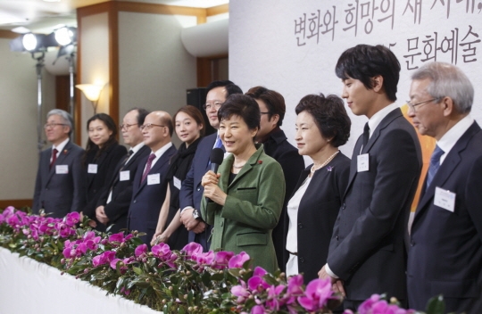 ½Å³âÀλçȸ Á÷ÈÄ, ¹Ú ´ëÅë·ÉÀº ¿¹¼úÀÇÀü´ç ÄܼƮȦ¿¡¼ ¿¸®´Â ¡®2015 ½Å³âÀ½¾Çȸ¡¯¿¡ Âü¼®ÇÕ´Ï´Ù. À̹ø À½¾Çȸ´Â ±¤º¹ 70ÁÖ³âÀ» ¸ÂÀÌÇÏ¿© ¿Â ±¹¹ÎÀÌ ÈÇÕÇÏ¿© »õ·Ó°Ô µµ¾àÇÏ´Â ´ëÇѹα¹À» ¿°¿øÇÏ´Â ÃëÁö¿¡¼, ´Ù¾çÇÑ À帣¿¡ ¼ÓÇÑ ¿¹¼úÀεéÀÇ Èñ¸ÁÂù ¹«´ë·Î ÁøÇàµË´Ï´Ù. ƯÈ÷ À̹ø Çà»ç¿¡´Â ¹®È¿¹¼ú, Á¾±³, ¾ð·Ð, ÀÔ¹ý, »ç¹ý, °æÁ¦ µî °¢°è ÁÖ¿ä Àλç»Ó¸¸ ¾Æ´Ï¶ó ±¹°¡À¯°øÀÚ, ÆÄµ¶±¤ºÎ¤ý°£È£»ç, ´Ù¹®È°¡Á·, ÀÚ¿øºÀ»çÀÚ, Â÷¼¼´ë ÀÎÀç µî ÀÏ¹Ý ±¹¹Î 700¸íÀ» Æ÷ÇÔÇÑ 2,000¿© ¸íÀÌ ÃÊûµÆ½À´Ï´Ù.