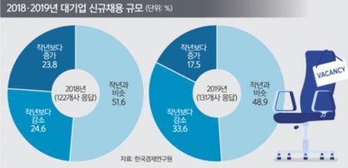 ¿ÃÇØ ´ë±â¾÷ 10°÷ Áß 3°÷Àº ½Å±Ô ä¿ëÀÇ ±Ô¸ð¸¦ Áö³Çغ¸´Ù ÁÙÀδÙ. Çѱ¹°æÁ¦¿¬±¸¿øÀº ¿©·ÐÁ¶»ç±â°ü ¸®¼Ä¡¾Ø¸®¼Ä¡¿¡ ÀÇ·ÚÇØ 2019³â ÁÖ¿ä ´ë±â¾÷ ´ëÁ¹ ½Å±Ôä¿ë °èȹÀ» Á¶»çÇÑ °á°ú ¿ÃÇØ ½Å±Ôä¿ëÀ» ´Ã¸®°Ú´Ù´Â ±â¾÷Àº 17.5%¿¡ ±×ÃÆ´Ù°í À̳¯ ¹àÇû´Ù.
