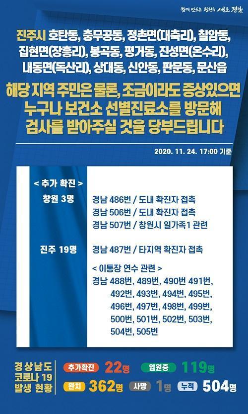 25ÀÏ ¿ÀÀü °æ»ó³²µµ ºê¸®Çο¡ µû¸£¸é, ½Å±Ô È®ÁøÀÚ´Â ÁøÁÖ 19¸í(°æ³² 487¹ø~505¹ø), â¿ø 3¸í(°æ³² 486¹ø, 506~507¹ø)À̸ç, È®ÁøÀÏÀº 24ÀÏ 1¸í(°æ³² 486¹ø), 25ÀÏ 21¸í(°æ³² 487~507¹ø)ÀÌ´Ù.