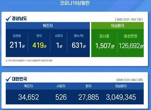 1ÀÏ ¿ÀÈÄ 1½Ã ÇöÀç °æ³² Äڷγª19 ´©Àû È®ÁøÀÚ´Â ÃÑ 631¸íÀÌ´Ù. 211¸íÀº ÀÔ¿ø Ä¡·á ÁßÀ̰í 419¸íÀº Åð¿øÇßÀ¸¸ç 1¸íÀº »ç¸ÁÀÚ´Ù.