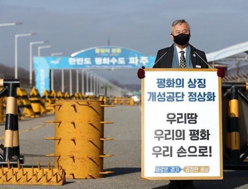 ±×·¸°Ô 1ÀÎ ½ÃÀ§¿¡ ³ª¼± Áö ÇÑ ´Þ°ÀÎ Áö³ 9ÀÏ, ¿ÀÀü 11½Ã¸¶´Ù ¡®ÆòÈÀÇ »ó¡ °³¼º°ø´Ü Á¤»óÈ, ¿ì¸® ¶¥ ¿ì¸®ÀÇ ÆòÈ ¿ì¸® ¼ÕÀ¸·Î!¡¯¶ó´Â ¹®±¸°¡ ÀûÈù ÇÇÄÏÀ» ¸ñ¿¡ °É°í ÆÄÁÖ ÅëÀÏ´ë±³ ¾Õ¿¡ ¼± ±×¸¦ ¸¸³ª±â À§ÇØ ÆÄÁÖ·Î ÇâÇß´Ù.