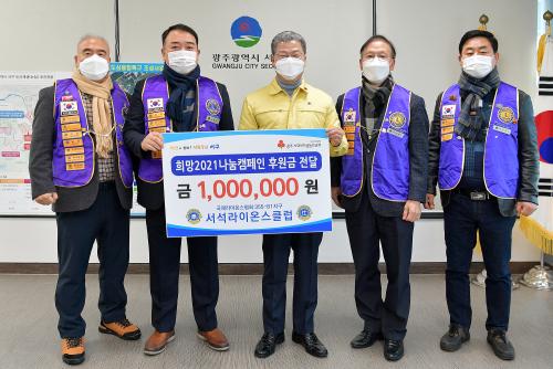 [½Åµ¿¾Æ¹æ¼Û=°¼º´ë ±âÀÚ] ±¤ÁÖ ¼±¸(±¸Ã»Àå ¼´ë¼®)´Â ÃÖ±Ù ±¹Á¦¶óÀ̿½ºÇùȸ 355-B1Áö±¸ ¼¼®¶óÀ̿½ºÅ¬·´(ȸÀå °í±¤¹Î)À¸·ÎºÎÅÍ ¿¬¸»¿¬½Ã ÀÌ¿ôÀÇ µû¶æÇÑ Á¤À» ³ª´©±â À§ÇÑ Èñ¸Á2021 ³ª´® Ä·ÆäÀÎ ÈÄ¿ø±Ý(100¸¸¿ø)À» Àü´Þ¹Þ°í ¾î·Á¿î ÀÌ¿ôÀ» À§ÇØ ÈÄ¿øÇØ Áֽŵ¥ ´ëÇØ °¨»çÀÇ ¸¶À½À» Àü´ÞÇß´Ù°í 10ÀÏ ¹àÇû´Ù.