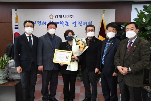 [¿¡ÄÚȯ°æÀϺ¸=±èÇØ Ȳ¿ëȯ ±âÀÚ] ±èÇØ½ÃÀÇȸ ÁÖÁ¤¿µ ÀÇ¿øÀÌ Áö³­ 20ÀÏ, Àü±¹½Ã𐄁±ºÀÚÄ¡±¸ÀÇȸÀÇÀåÇùÀÇȸ¿¡¼­ ¼ö¿©ÇÏ´Â ¡®Áö¹æÀÇÁ¤ºÀ»ç»ó¡¯À» ¼ö»óÇß´Ù.