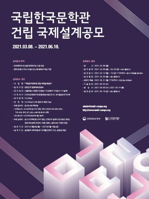 3¿ù 8ÀÏ(¿ù)ºÎÅÍ 4¿ù 9ÀÏ(±Ý)±îÁö ¡®±¹¸³Çѱ¹¹®Çаü °Ç¸³ ±¹Á¦ ¼³°è°ø¸ð¡¯ ´©¸®Áý¿¡¼ Âü°¡ µî·ÏÀ» ¹ÞÀ¸¸ç, Âü°¡ µî·ÏÀÚ¿¡ ÇÑÇØ 5¿ù 31ÀÏ(¿ù)±îÁö ¼³°è¾ÈÀ» Á¢¼öÇÑ´Ù. ÀÌÈÄ ±â¼ú°ËÅä¿Í ÀÛǰ½É»ç¸¦ °ÅÃÄ 6¿ù 18ÀÏ(±Ý)¿¡ ÃÖÁ¾ ´ç¼±ÀÛÀ» ¹ßÇ¥ÇÒ ¿¹Á¤ÀÌ´Ù.