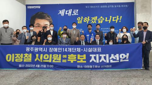 ºÏ±¸ Àå¾ÖÀÎ º¹Áöȸ(ÇÑ»óµæ), »ç)±¤ÁÖ Àå¾ÖÀÎ »ç¶û º¹Áöȸ(ÃÖÈï±Ô), Àå¾ÖÀÎ ¹®È¿¹¼ú Áö¿ø¼¾Å¸(Á¤Áø»ï) µî 14°³ ´Üü´Â 25ÀÏ ¿ÀÀü ±¤ÁÖ½ÃÀÇȸ ÀÌÁ¤Ã¶ ¿¹ºñÈĺ¸ ¼±°ÅÄ·ÇÁ¿¡¼ ±âÀÚȸ°ßÀ» °³ÃÖÇÏ°í ¡°ÁÖ¹ÎÀ» ´ëº¯ÇÏ°í ¼¶±æ ÁÙ ¾Æ´Â ±×·± Á¤Ä¡ÀÎÀ» ÁöÁöÇÑ´Ù¡±¸ç ÀÌÁ¤Ã¶ ¿¹ºñÈ常¦ ÀûÀÓÀÚ·Î ³»¼¼¿ü´Ù.