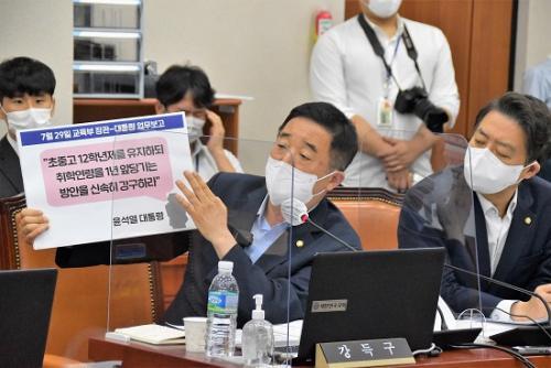ÀÌ¾î °µæ±¸ ÀÇ¿øÀº ¡°¸¸5¼¼ Ãʵî ÀÔÇÐÀº À±¼®¿ ´ëÅë·É²²¼ ¾÷¹«º¸°í ¶§ ±³À°ºÎ Àå°ü¿¡°Ô Áö½ÃÇÑ ³»¿ë¡±À̶ó¸ç, ¡°Åë»óÀûÀ¸·Î ¾÷¹«º¸°í¸¦ ÇÒ ¶§ û¿Í´ë ºñ¼½Ç°úÀÇ »çÀü ³íÀǰ¡ ÀÌ·ç¾îÁöÁö ¾Ê´À³Ä¡±°í ¹°¾ú°í, ÀÌ¿¡ Àå Â÷°üÀº ¡°¸Â´Ù¡±°í ´äº¯Çß´Ù.
