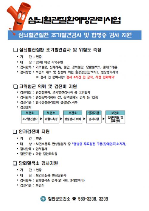 1Â÷ °Ë»ç¿¡¼´Â Ç÷¾Ð¡¤Ç÷´ç¡¤ÄÝ·¹½ºÅ×·Ñ µîÀÇ °Ë»ç¿Í ÇÔ²² »ýȰ½À°ü, µ¿¹ÝÁúȯ, ½É³úÇ÷°üÁúȯ °¡Á··Â, Ç÷¾×°Ë»ç ¼Ò°ß µîÀÇ ½É³úÇ÷°üÁúȯ À§Çèµµ¸¦ ÃøÁ¤ÇÏ¿©, °íÀ§ÇèÀÚ´Â 2Â÷ °ËÁøÀ¸·Î Çѱ¹°Ç°°ü¸®Çùȸ °æ»ó³²µµÁöºÎ¿Í ¿¬°èÇÏ¿© °ü»óµ¿¸Æ¼®È¸È CT, µ¿¸Æ°æÈµµ °Ë»ç µîÀ» Áö¿øÇÑ´Ù.