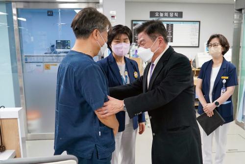 ÀÌ ±¸Ã»ÀåÀº ¡°Àü°øÀǵéÀÇ ÀÇ·áÇöÀå Áý´Ü ÀÌÅ» µî ÀÇ·á°ø¹éÀÌ ¹ß»ýÇÑ »óȲ¿¡¼­, ƯÈ÷ ÀÀ±Þ½Ç ¹× ¼ö¼ú½Ç ÇʼöÀÇ·á ÀηµéÀÇ ¾î·Á¿òÀÌ ¸Å¿ì Ŭ °ÍÀ¸·Î ¿¹»óµÈ´Ù¡±¸ç ¡°¾î·Á¿î »óȲ ¼Ó¿¡¼­µµ ²à²àÀÌ ÇöÀåÀ» ÁöÄÑÁֽŠÀÇ·áÁøºÐµé²² ±¸¹ÎµéÀ» ´ëÇ¥ÇÏ¿© ±íÀº °¨»ç¸¦ µå¸°´Ù¡±°í Àλ縦 ÀüÇß´Ù.