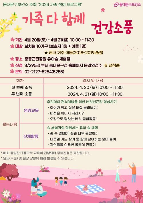 À̹ø ÇÁ·Î±×·¥Àº ¿µ¾ç ±³À°°ú ½ÅüȰµ¿ üÇèÀ¸·Î ³ª´² ÁøÇàµÈ´Ù. ¿µ¾ç ±³À°Àº Æí½Ä ¿¹¹æÀ» À§ÇÑ ¹ö¼¸ ¼û¹Ù²ÀÁú, ¹ö¼¸ ¿À°¨ ŽÇèȰµ¿ µîÀ¸·Î ±¸¼ºµÇ¾úÀ¸¸ç, ½ÅüȰµ¿ üÇèÀº ½£ ¼ÓÀ» °ÉÀ¸¸ç ²É°ú ³ª¹« °üÂûÇϱâ, ³ª¹µÀÙ Ä«µå ã±â, ÀÚ¿¬¹°À» ÀÌ¿ëÇÑ ¿ÃìÀÌ ¸¸µé±â µî ½£ ÇØ¼³°¡¿Í ÇÔ²²Çϴ Ȱµ¿À¸·Î ±¸¼ºµÈ´Ù.