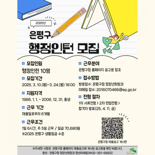 ¸ðÁý ´ë»óÀº ÀºÆò±¸¿¡ °ÅÁÖÇÏ´Â 19¼¼ºÎÅÍ 39¼¼ ¹ÌÃë¾÷ û³âÀÌ´Ù. ¼±¹ßµÈ ÇàÁ¤ ÀÎÅÏÀº ¿À´Â 5¿ùºÎÅÍ 10¿ù±îÁö 6°³¿ù°£ ÀºÆò¿ª»çÇÑ¿Á¹Ú¹°°ü, ÀºÆò¹®È­¿¹¼úȸ°ü µîÀ» ºñ·ÔÇÑ 10°³ ±Ù¹«Ã³¿¡ ¹èÄ¡µÅ ÇàÁ¤ »ç¹«¸¦ ¼öÇàÇÑ´Ù.