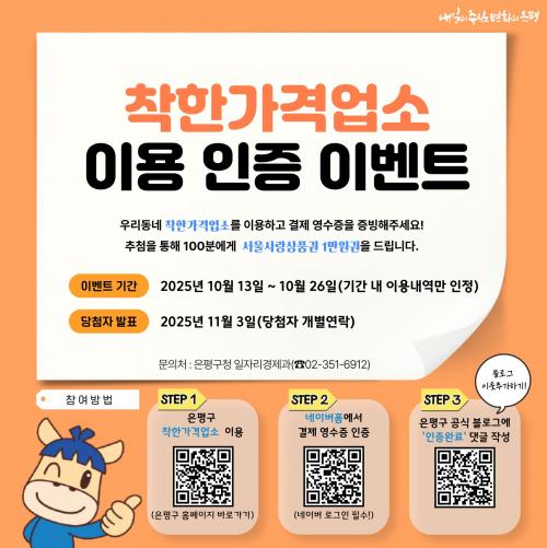 À̹ø À̺¥Æ®´Â °ü³» ÂøÇѰ¡°Ý¾÷¼Ò¸¦ ÀÌ¿ëÇÏ´Â ´©±¸³ª Âü¿©ÇÒ ¼ö ÀÖ´Ù. Âü¿© ¹æ¹ýÀº ³×À̹ö ÆûÀ¸·Î °¡°Ô ÀÌ¿ë ¿µ¼öÁõÀ» Á¦ÃâÇϰí ÀºÆò±¸Ã» °ø½Ä ºí·Î±×¸¦ ÀÌ¿ô Ãß°¡ÇÑ µÚ ÇØ´ç À̺¥Æ® °Ô½Ã±Û¿¡ ÀÎÁõ ¿Ï·á ´ñ±ÛÀ» ÀÛ¼ºÇÏ¸é µÈ´Ù. ´Ü, À̺¥Æ® ±â°£ ³» ¿µ¼öÁõ¸¸ ÀÎÁ¤µÈ´Ù.