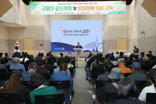 °ø¿µ¹Î °íÈﱺ¼ö´Â ¡°¿Ü±¹ÀÎ °èÀý±Ù·ÎÀÚ´Â ¿ì¸® Áö¿ª ³ó¾î¾÷À» ÁöÅÊÇÏ´Â ¼ÒÁßÇÑ ±¸¼º¿øÀÌÀÚ µ¿¹ÝÀÚ¡±¶ó¸ç ¡°ÇÔ²² ÀÏÇÏ°í »ì¾Æ°¡´Â ÀÌ¿ôÀ¸·Î¼ ¾ÈÁ¤ÀûÀÎ ±Ù·Îȯ°æÀ» Á¶¼ºÇϰí, Á¸Áß°ú ¹è·Á°¡ ÀÚ¸® Àâ´Â °í¿ë ¹®È¸¦ ¸¸µé¾î °¡´Â °ÍÀÌ ¹«¾ùº¸´Ù Áß¿äÇÏ´Ù¡±°í ¸»Çß´Ù.
